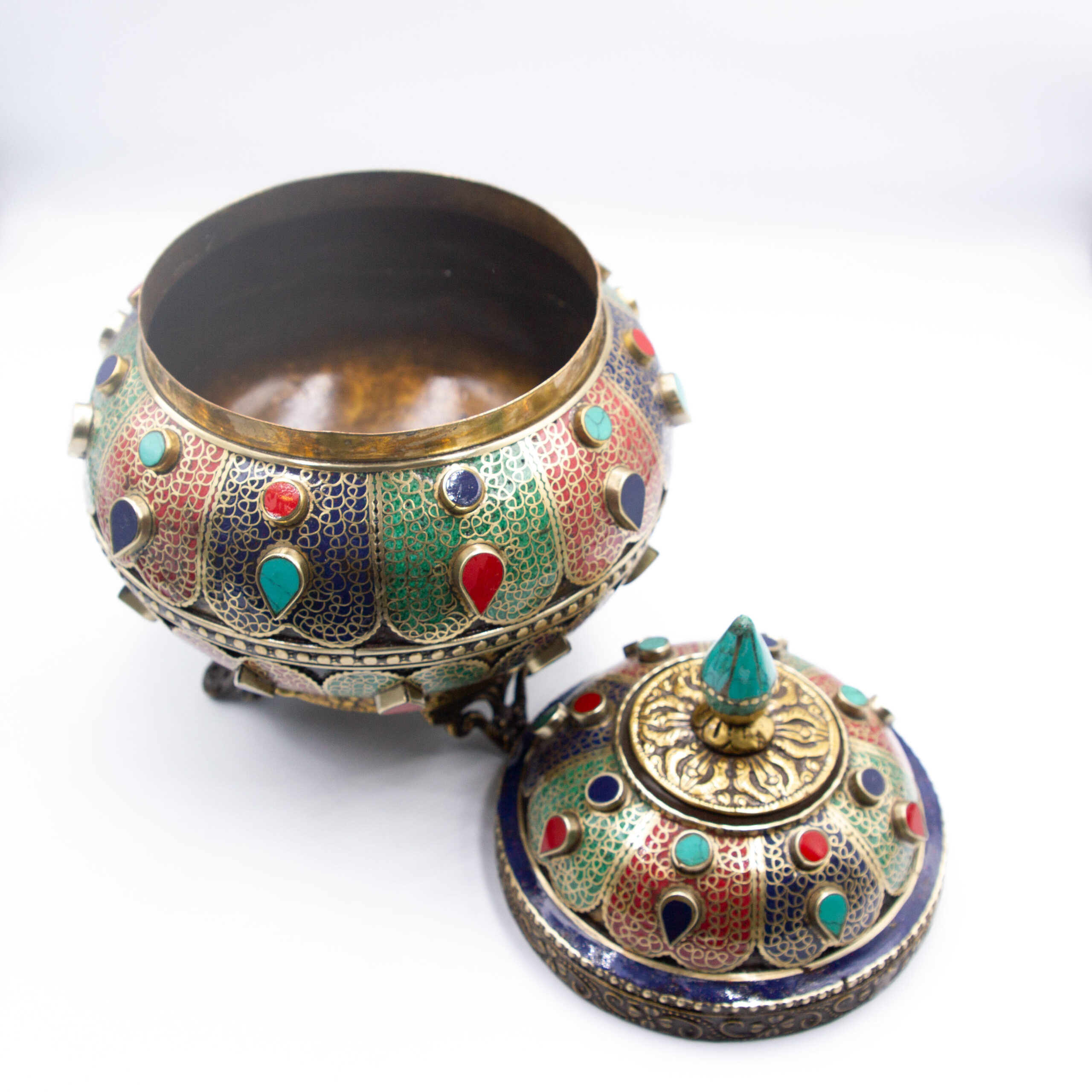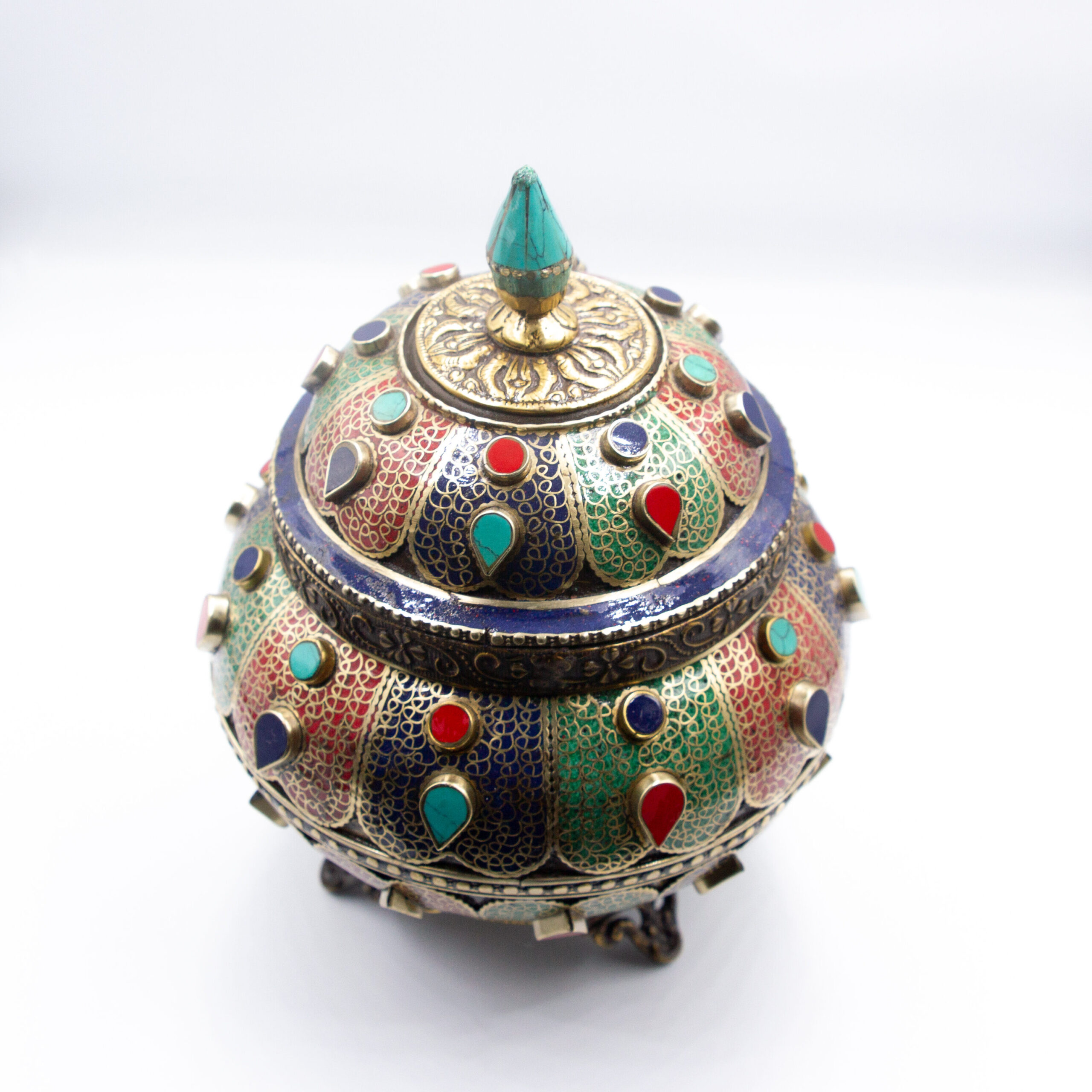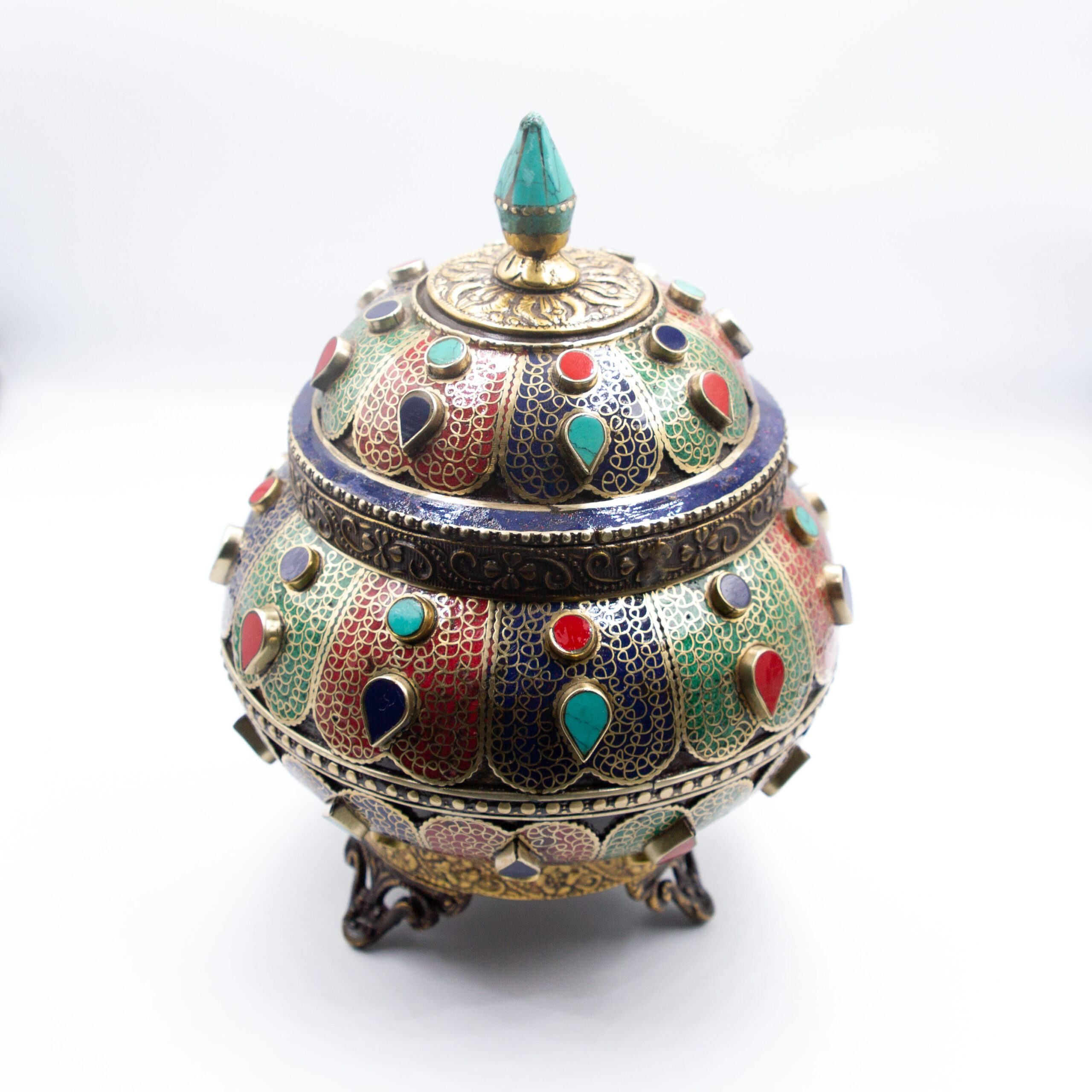 Title: Antique Filigree Treasure Pot Jar Home Decoration Turquoise Crystal, Rubies and Emeralds Gemstones, Lapis Lazuli Crystal Handcrafted in Nepal