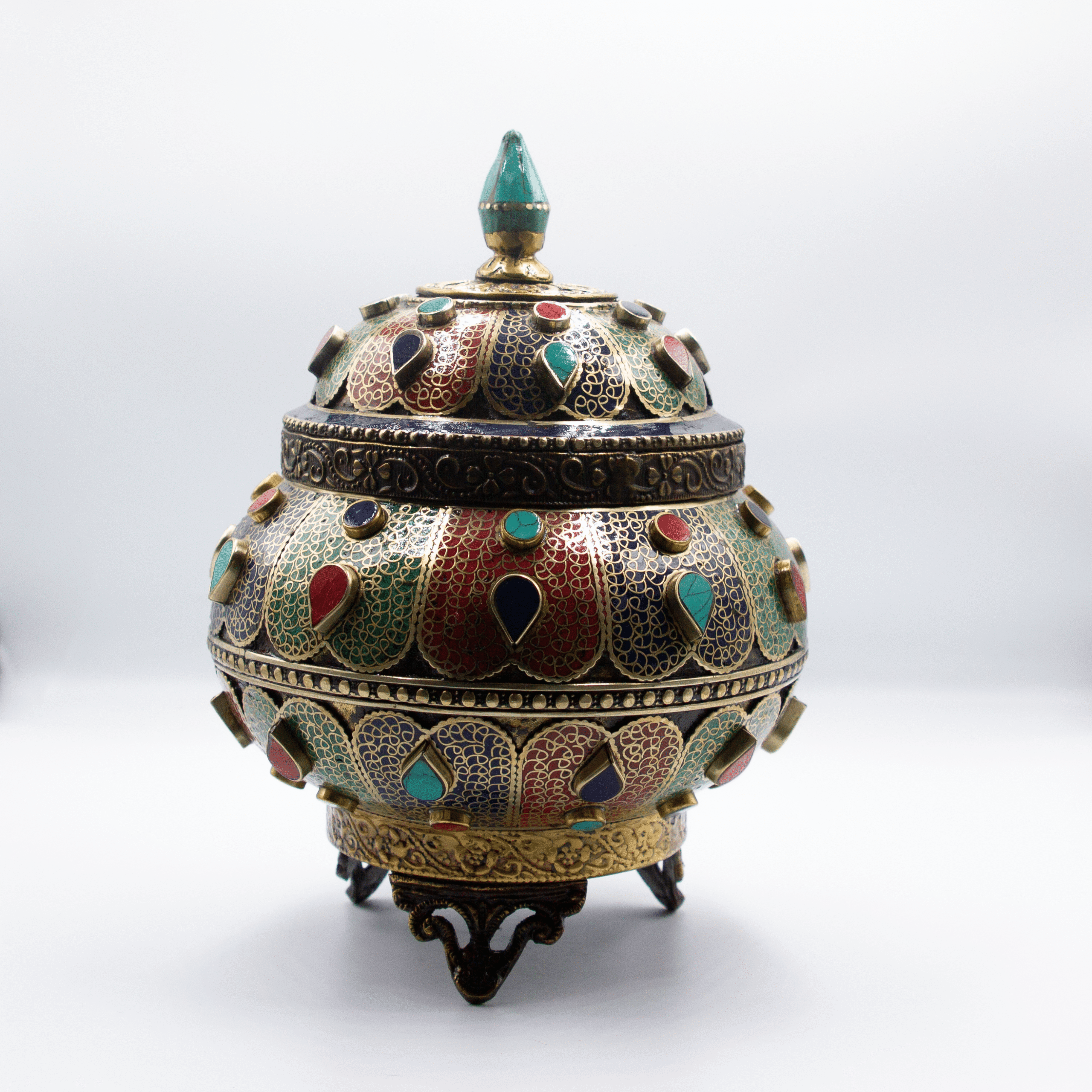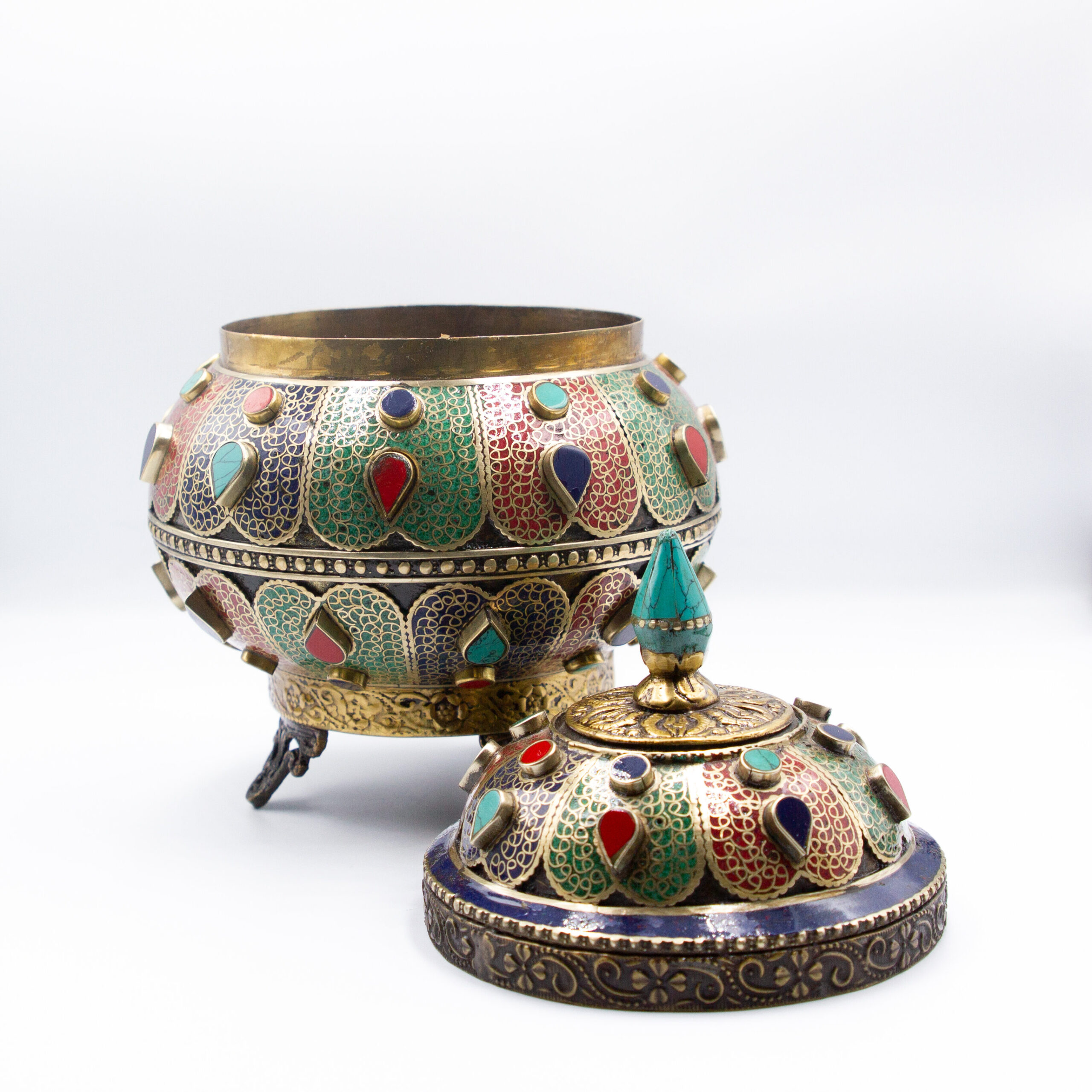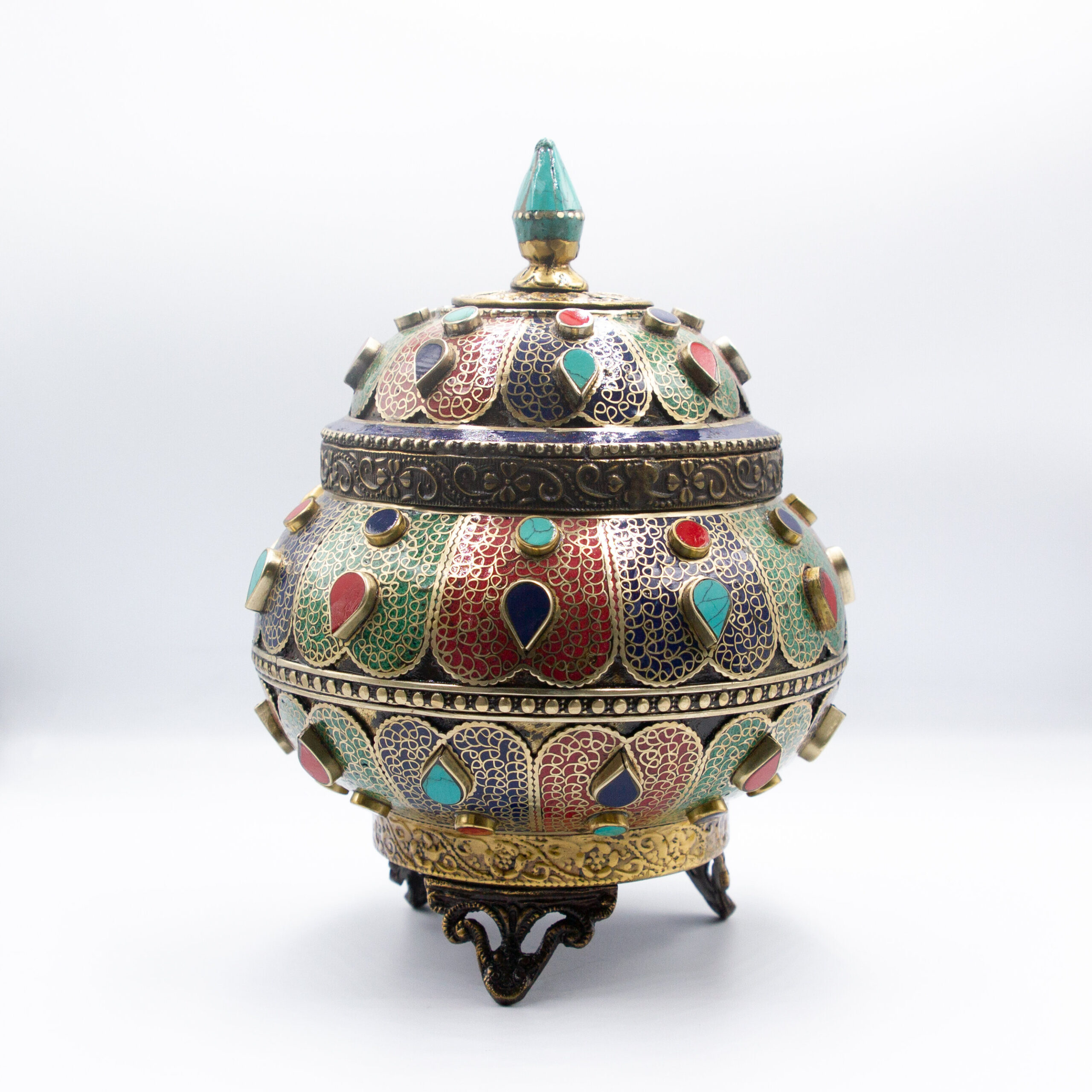 Title: Antique Filigree Treasure Pot Jar Home Decoration Turquoise Crystal, Rubies and Emeralds Gemstones, Lapis Lazuli Crystal Handcrafted in Nepal