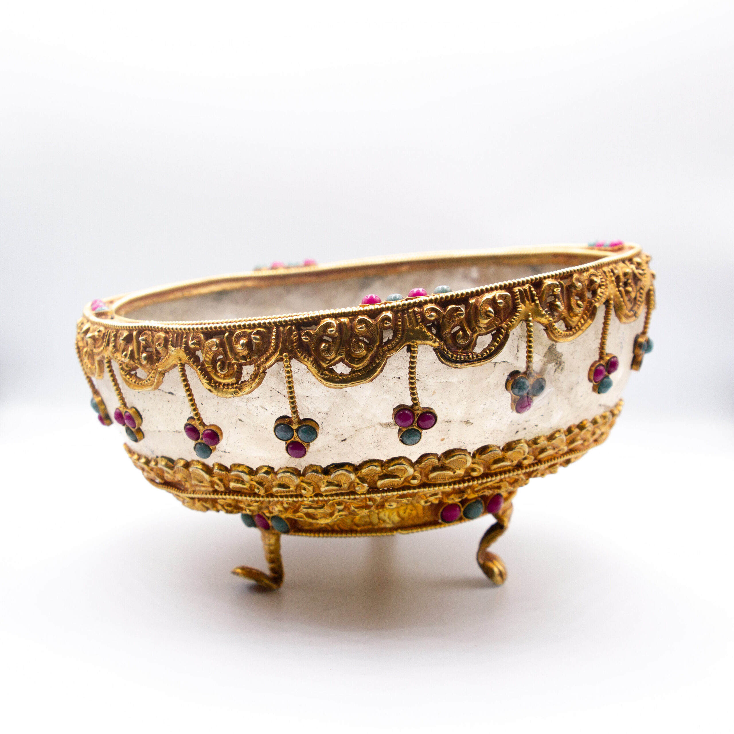 Title: Antique Tibetan Style Gold Plated Gilt Filigree, Ruby And Emerald Mounted Rock Crystal Bowl