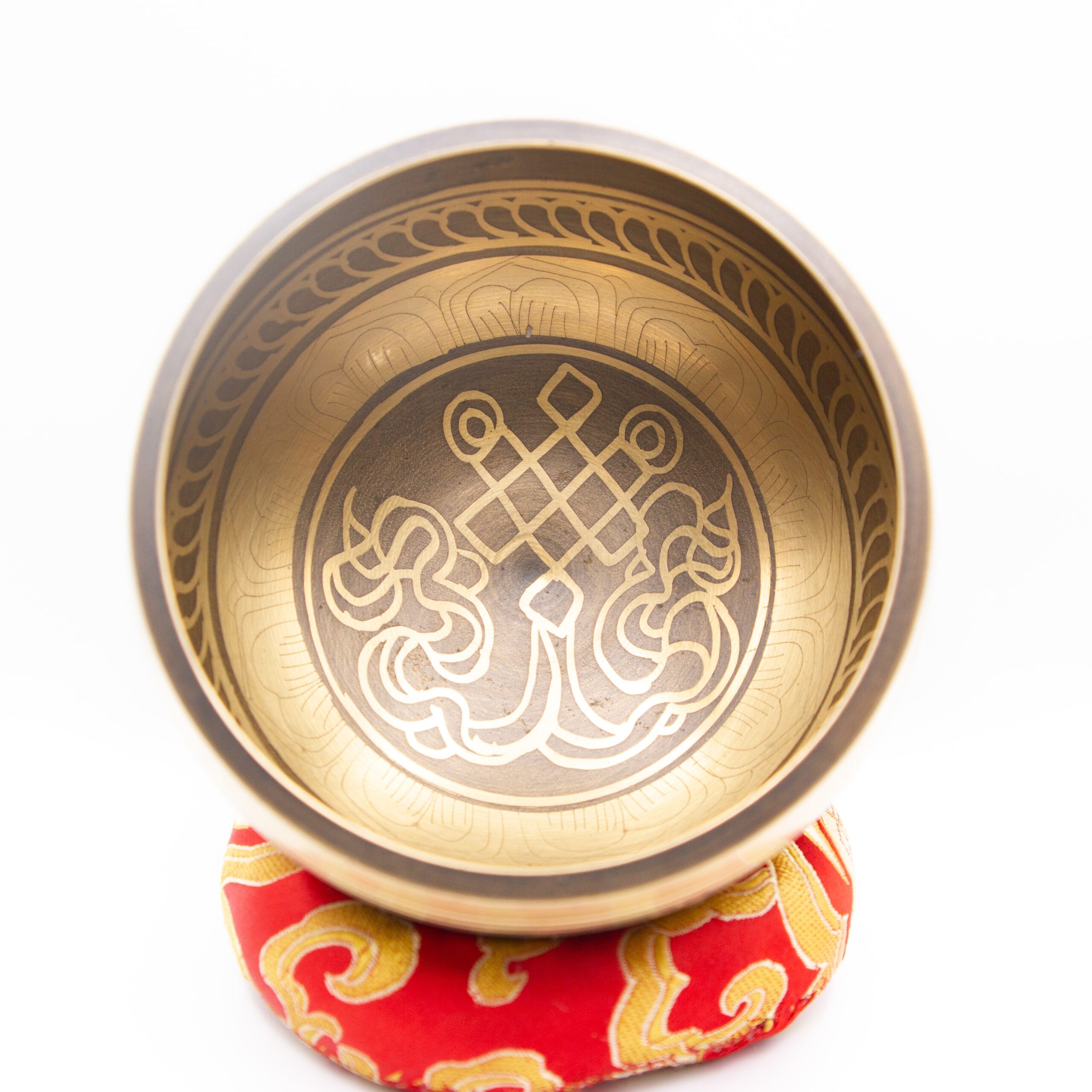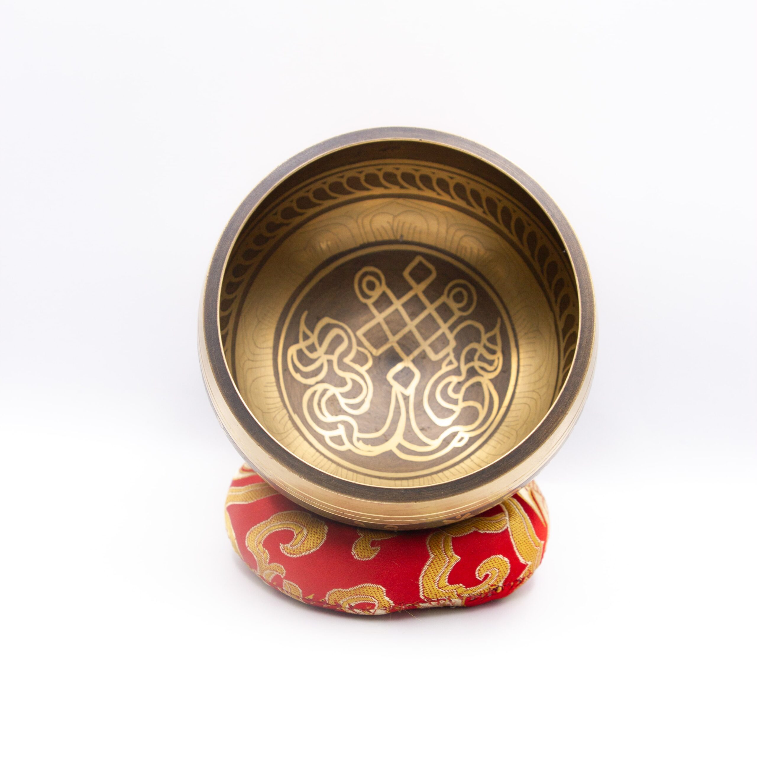 Authentic Himalayan Endless Knot Singing Bowl Single Set Handcrafted in Nepal (300 grams) Includes Traditional Wooden Striker and Silk Cushion – Ideal for Healing, Mindfulness, Meditation, and Yoga