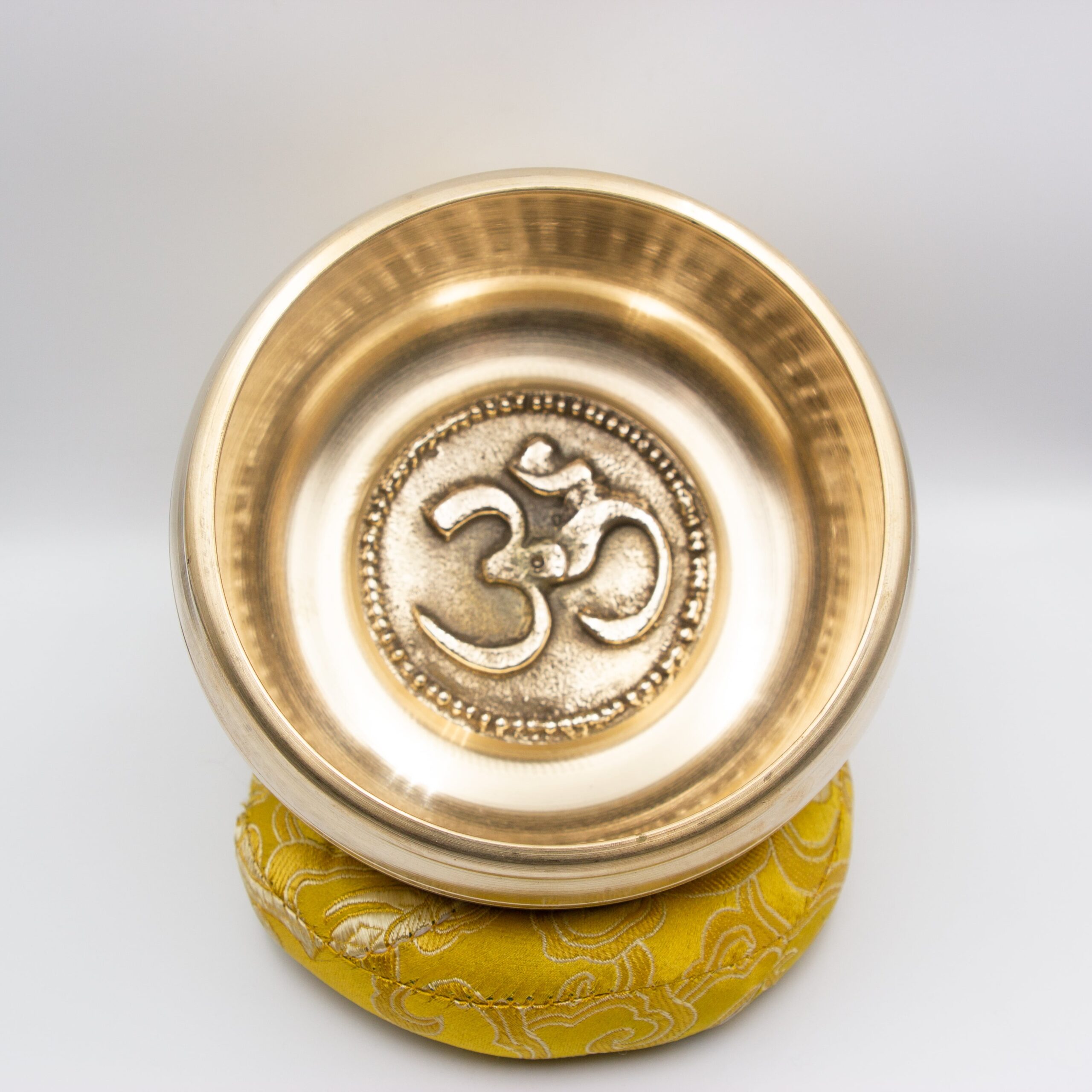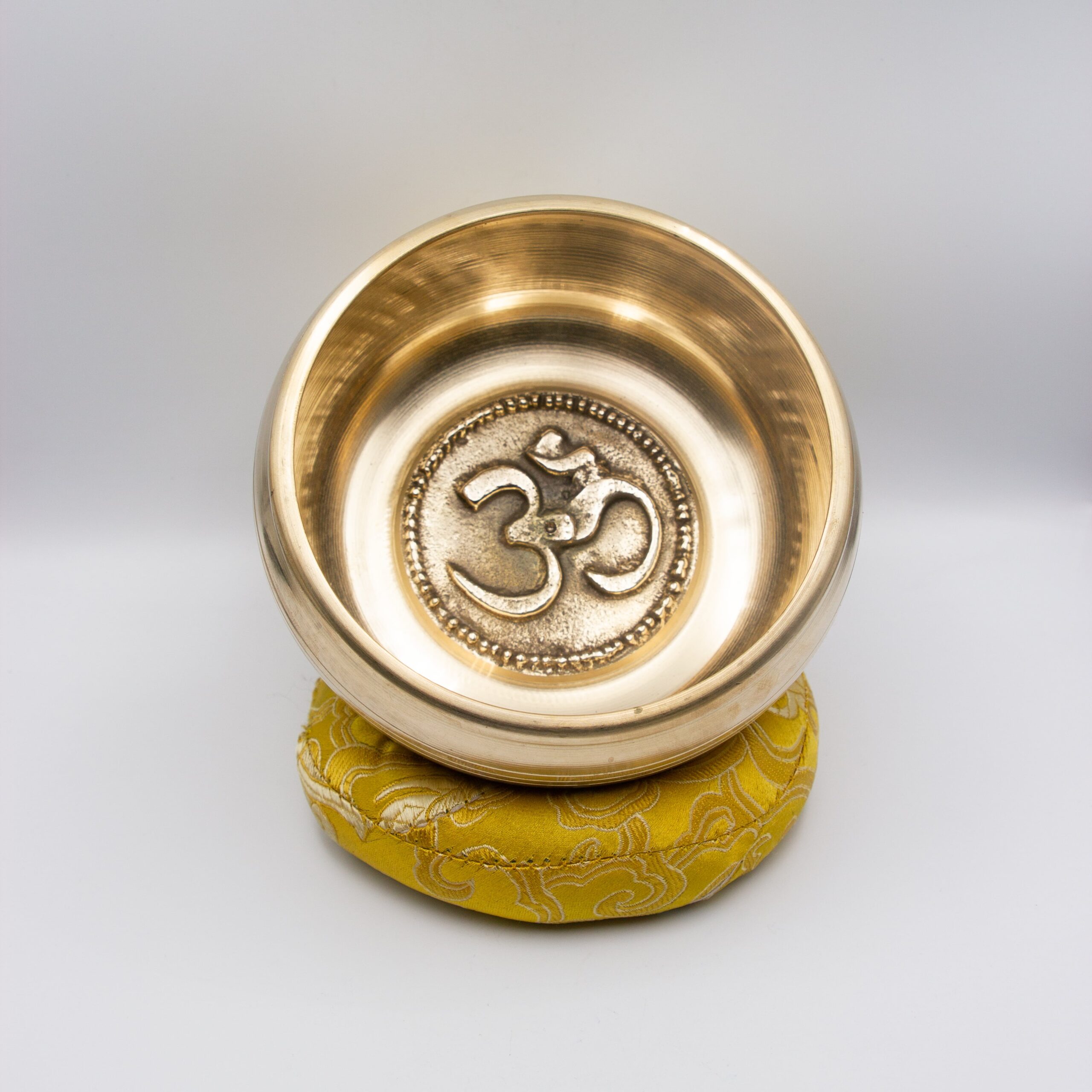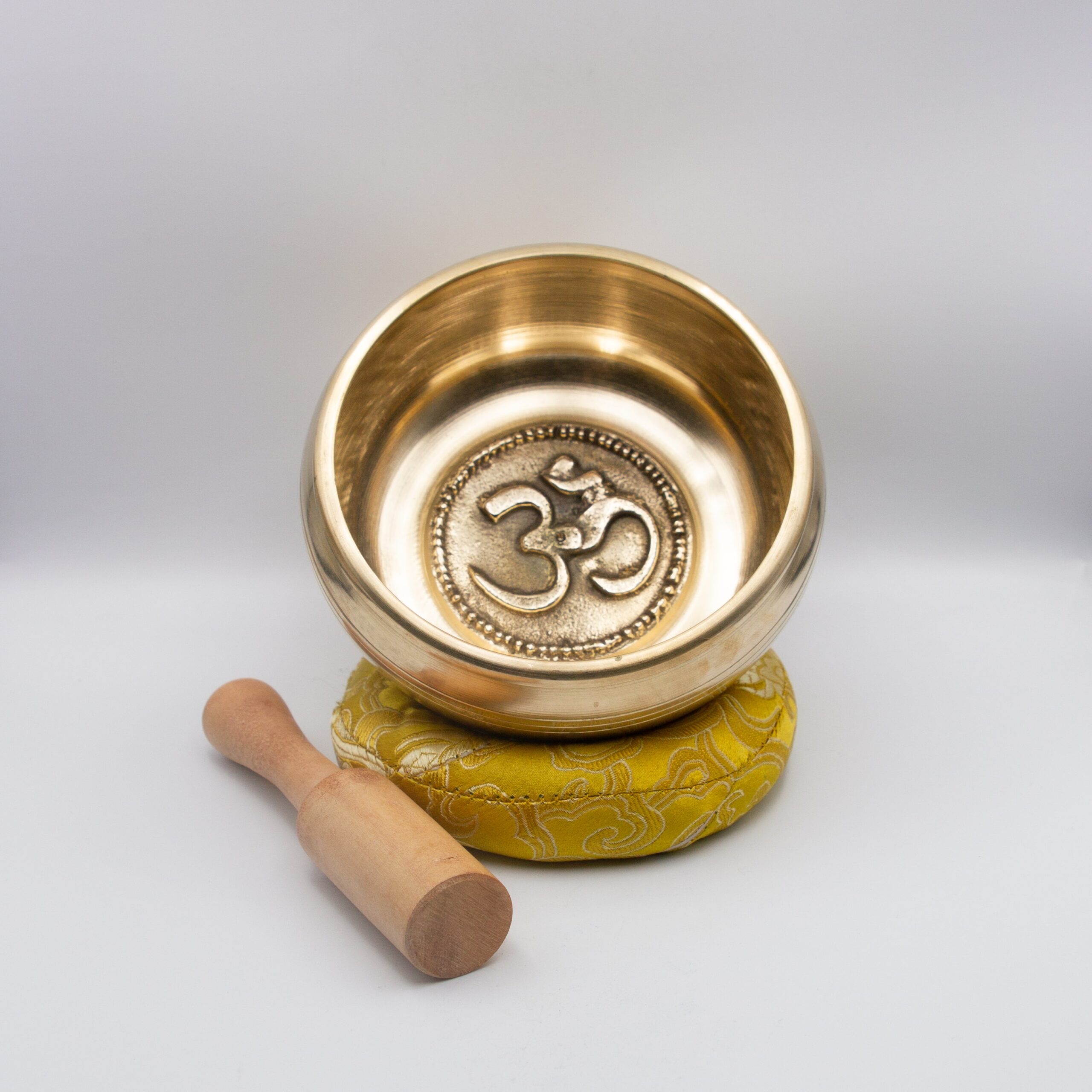Authentic Himalayan Golden Shinning OM Singing Bowl Single Set Handcrafted in Nepal (594 grams) – Includes Traditional Wooden Striker and Silk Cushion – Ideal for Healing, Mindfulness, Meditation, and Yoga