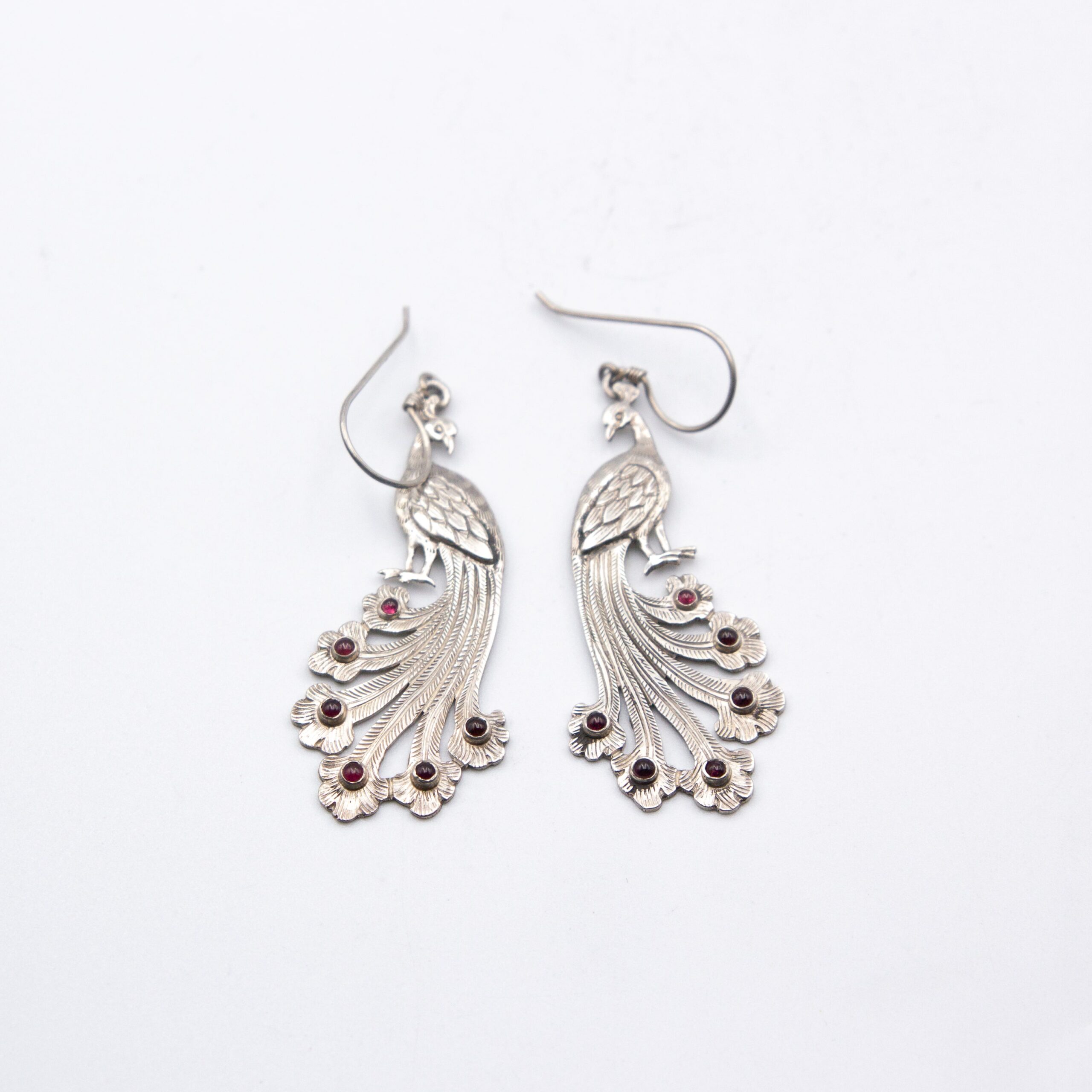 Exquisite 925 Sterling Silver Peacock Design with Red Carnelian Crystals Pair of Earrings