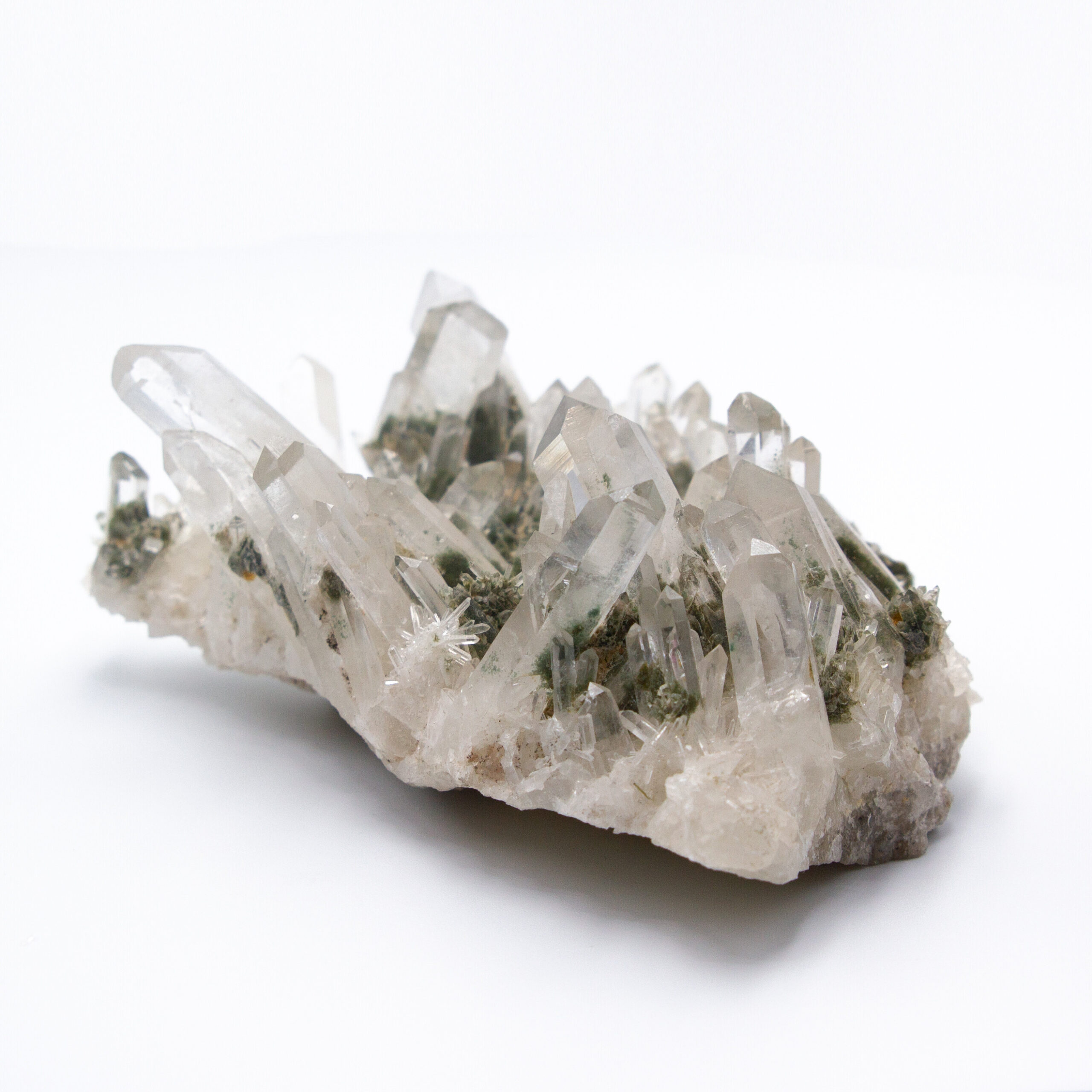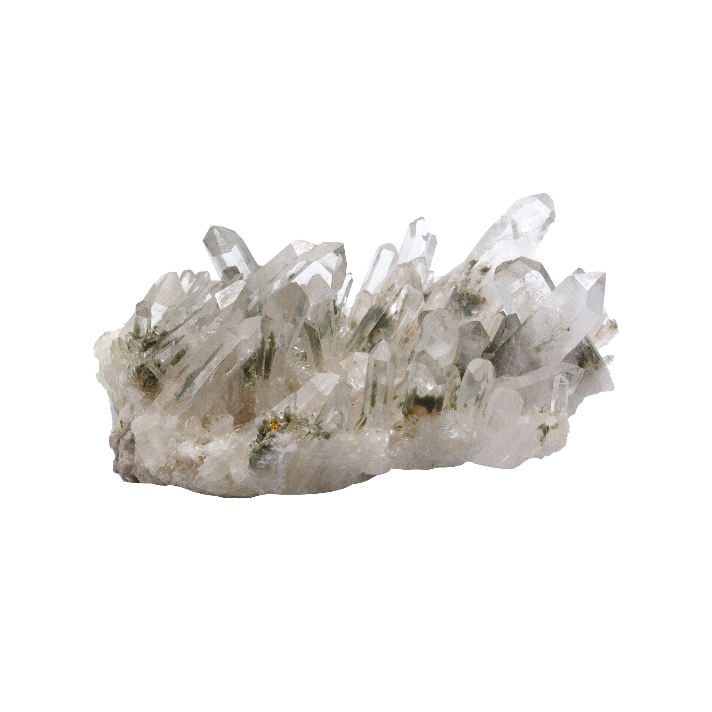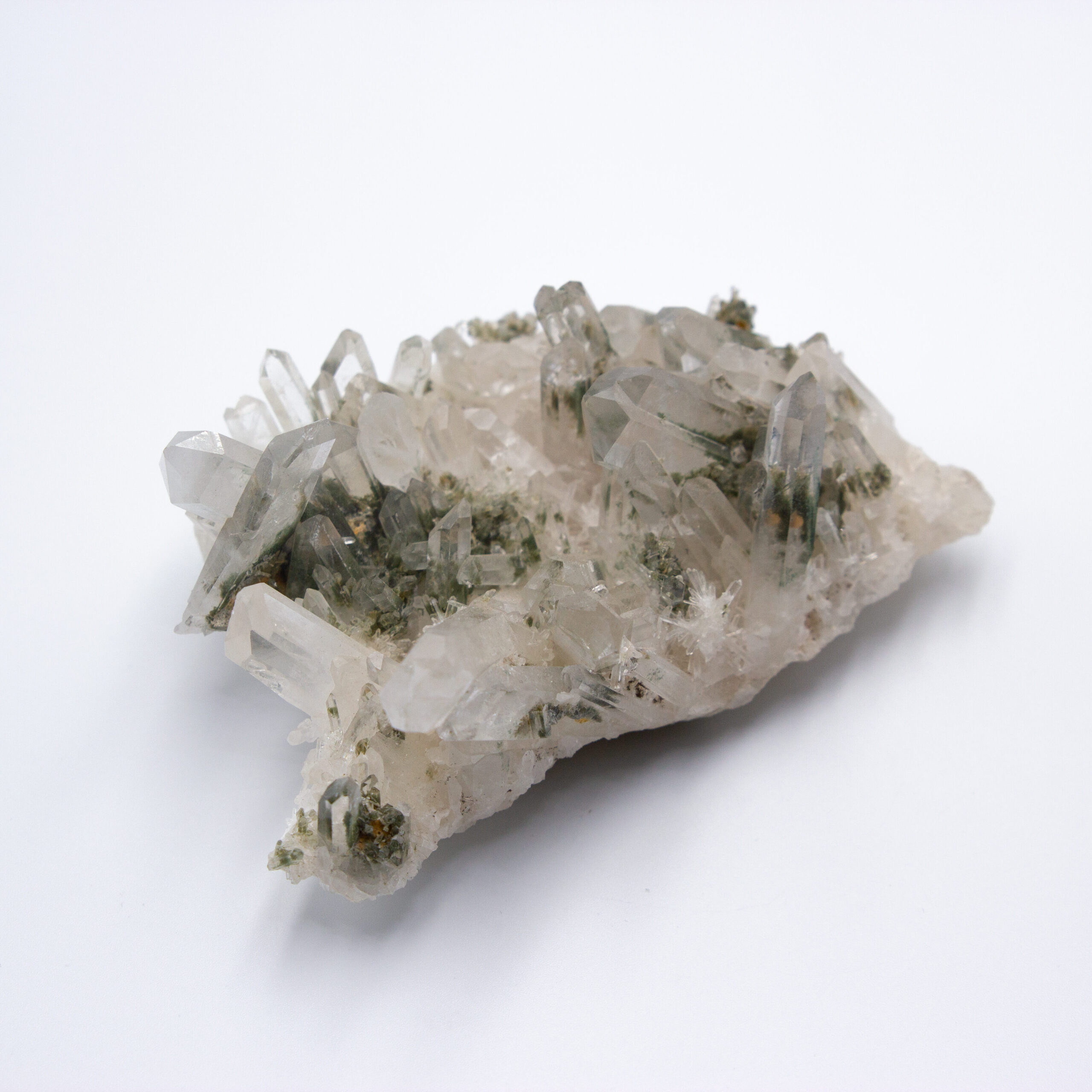 With its stunning blend of clear quartz and chlorite quartz, this cluster embodies the harmonious coexistence of purity and earthiness. The translucent clarity of clear quartz juxtaposes beautifully with the verdant hues of chlorite quartz, creating a captivating visual symphony that will mesmerize any beholder.