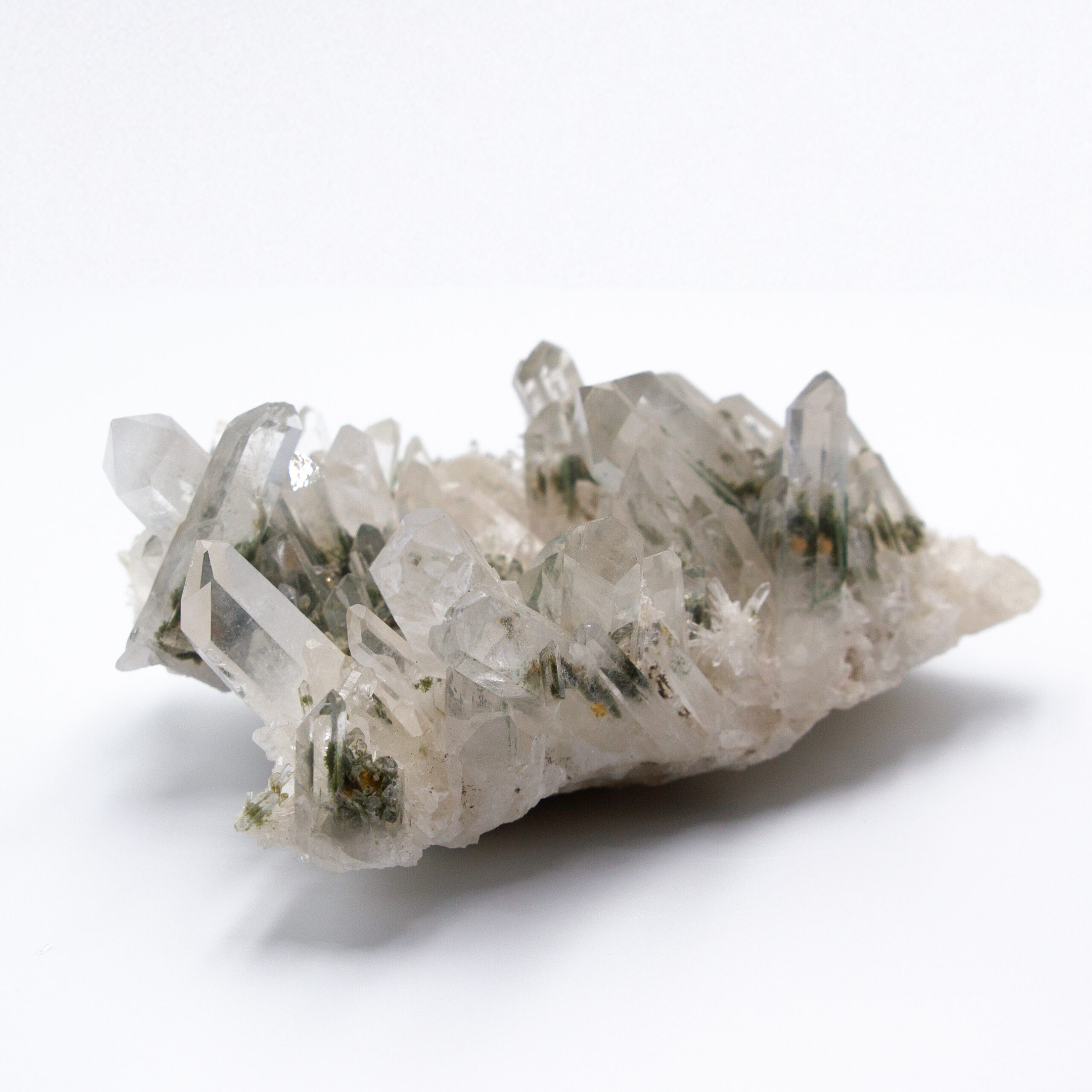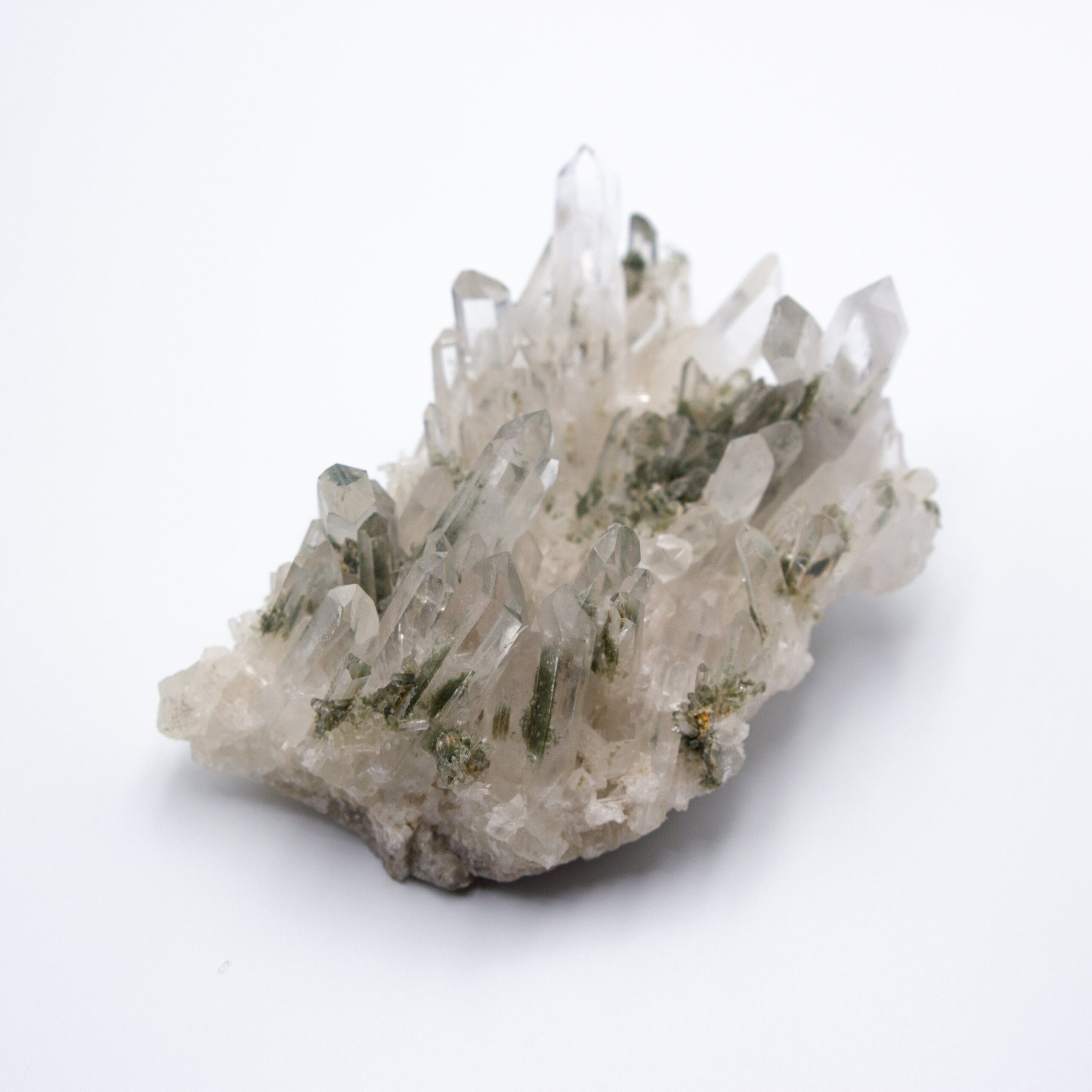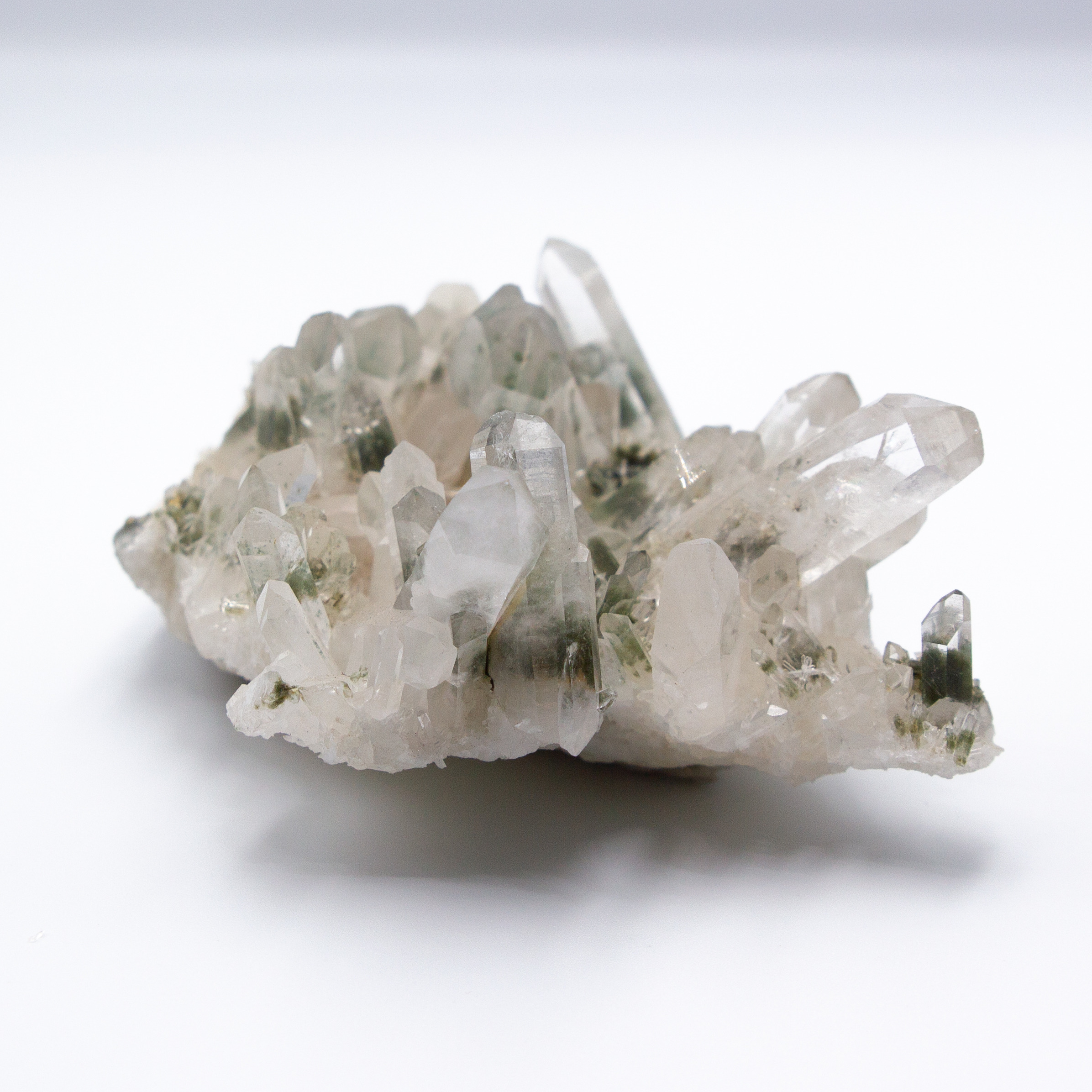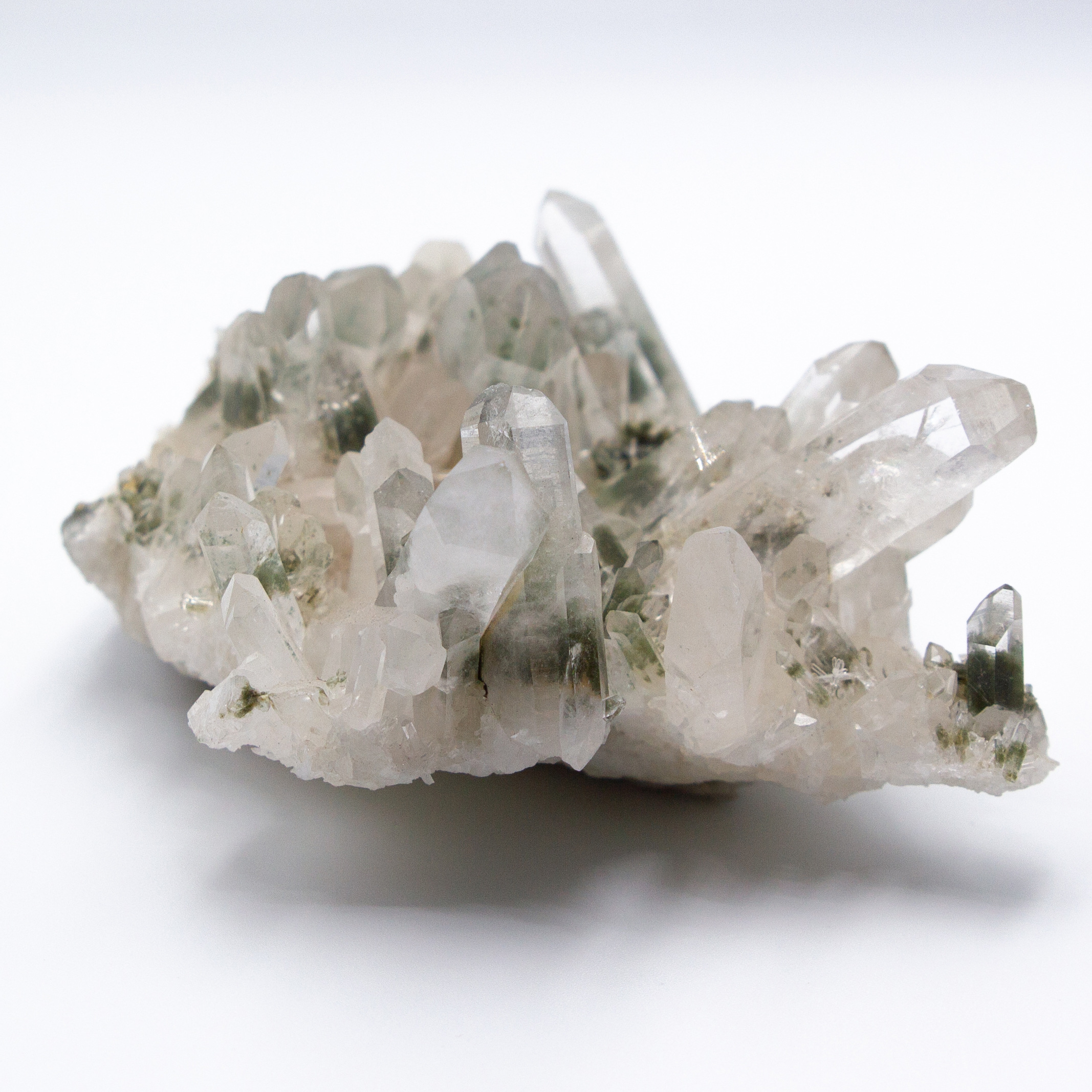 With its stunning blend of clear quartz and chlorite quartz, this cluster embodies the harmonious coexistence of purity and earthiness. The translucent clarity of clear quartz juxtaposes beautifully with the verdant hues of chlorite quartz, creating a captivating visual symphony that will mesmerize any beholder.