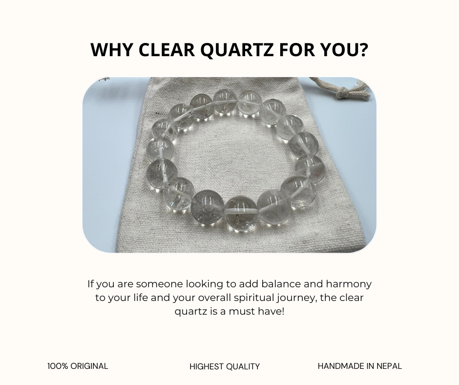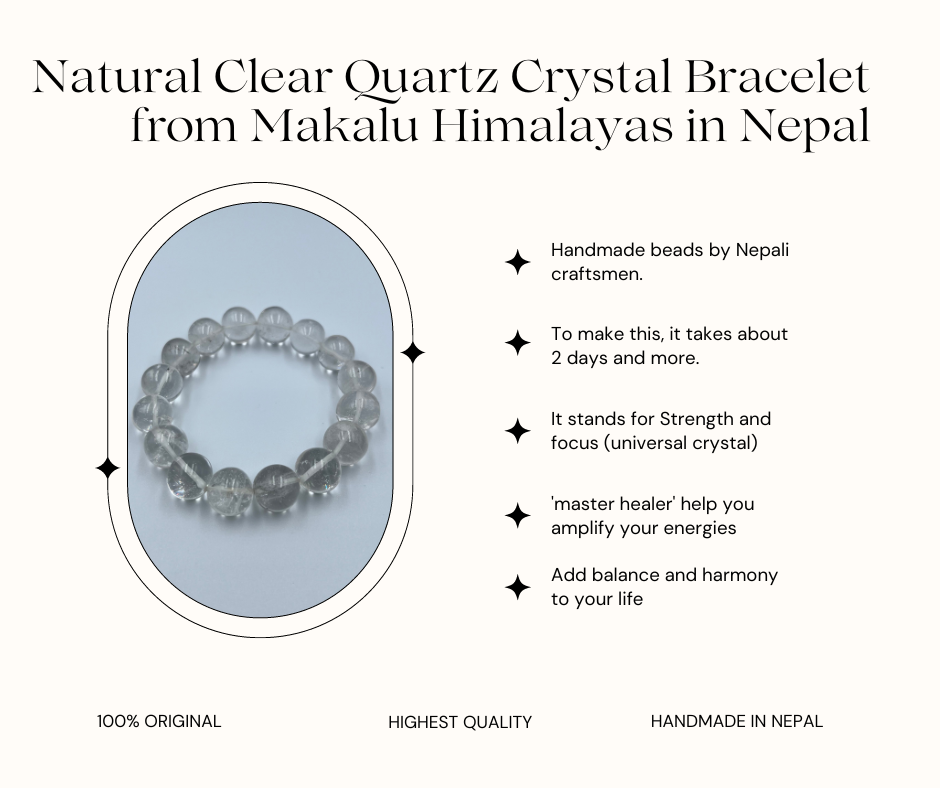 Discover the timeless beauty and healing energy of the Mount Makalu Natural Himalayan Nepal Clear Quartz Crystal Bracelet. Sourced from the rugged terrain of the Himalayas in Nepal, these exquisite 14mm clear quartz crystals are imbued with the pure essence of their majestic origins.