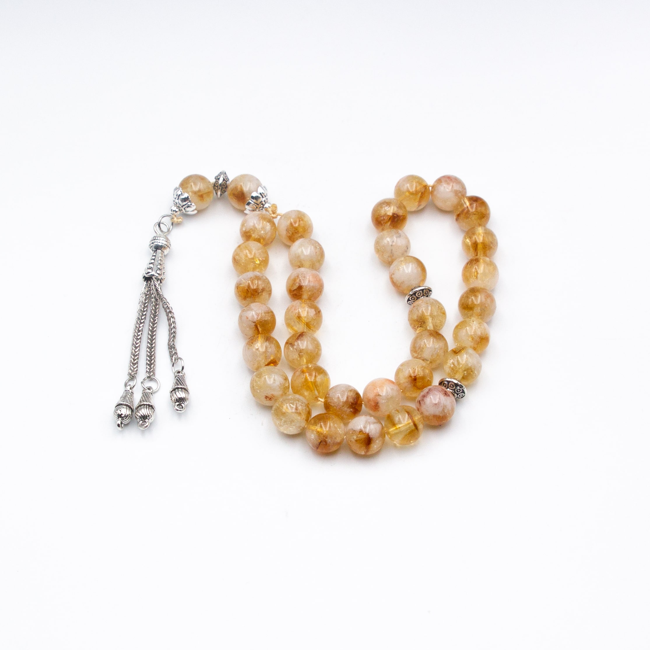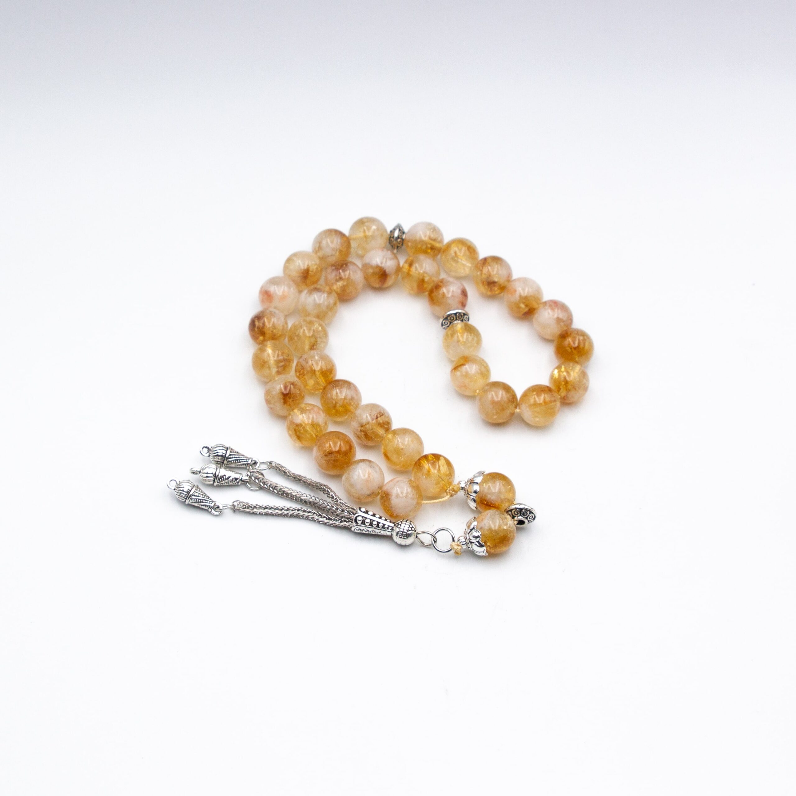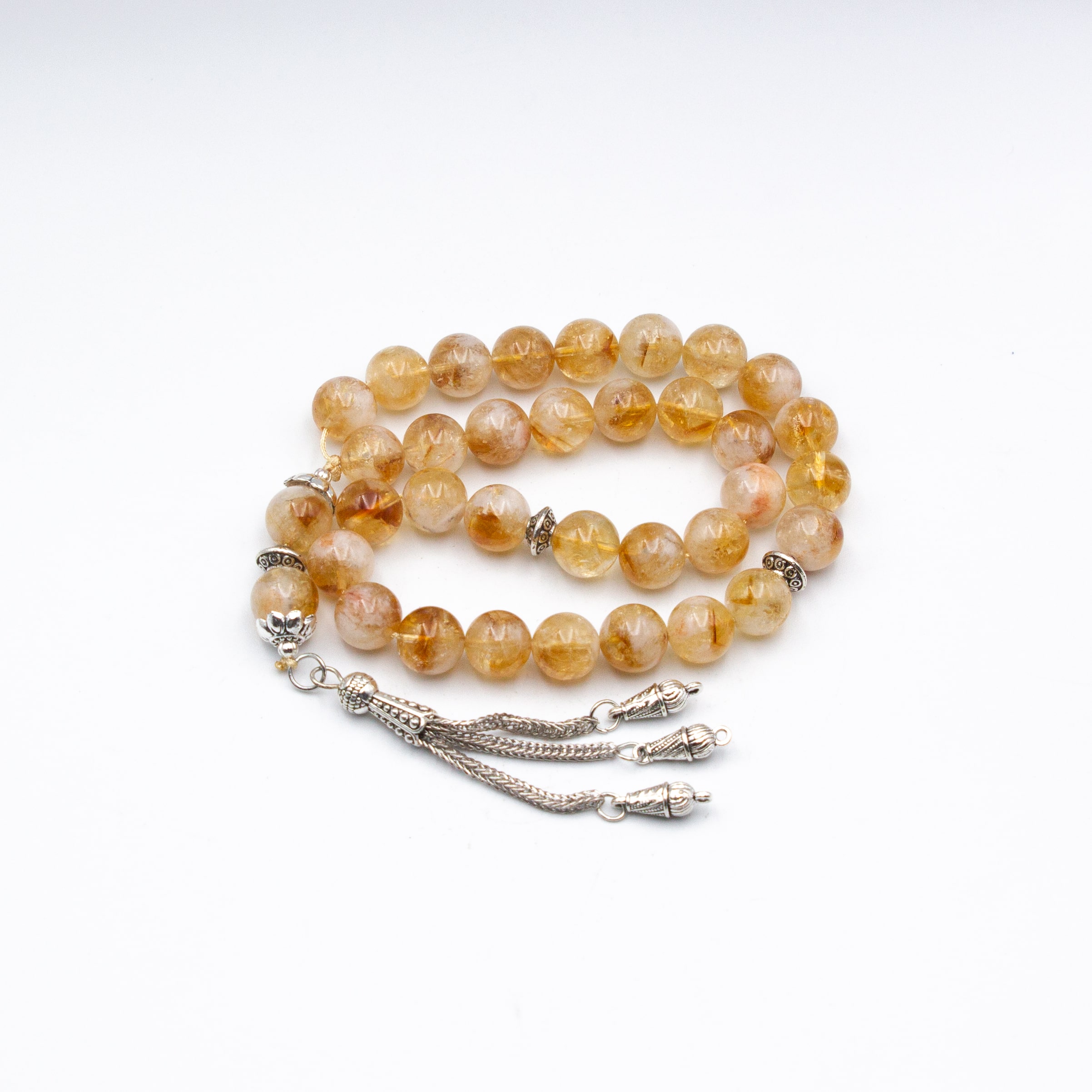 Embrace the serene beauty of these Natural Citrine Crystal Tasbih Prayer Beads. Crafted from authentic citrine crystals, each bead radiates warmth and positivity, making it an ideal companion for your spiritual journey. With a diameter of 10mm and a total of 33 beads, these prayer beads offer a comfortable grip and smooth texture for your prayers and meditation sessions. Let the vibrant energy of citrine crystals uplift your spirit and enhance your focus as you connect with your inner self. Order yours today and elevate your prayer experience with the power of citrine crystals.