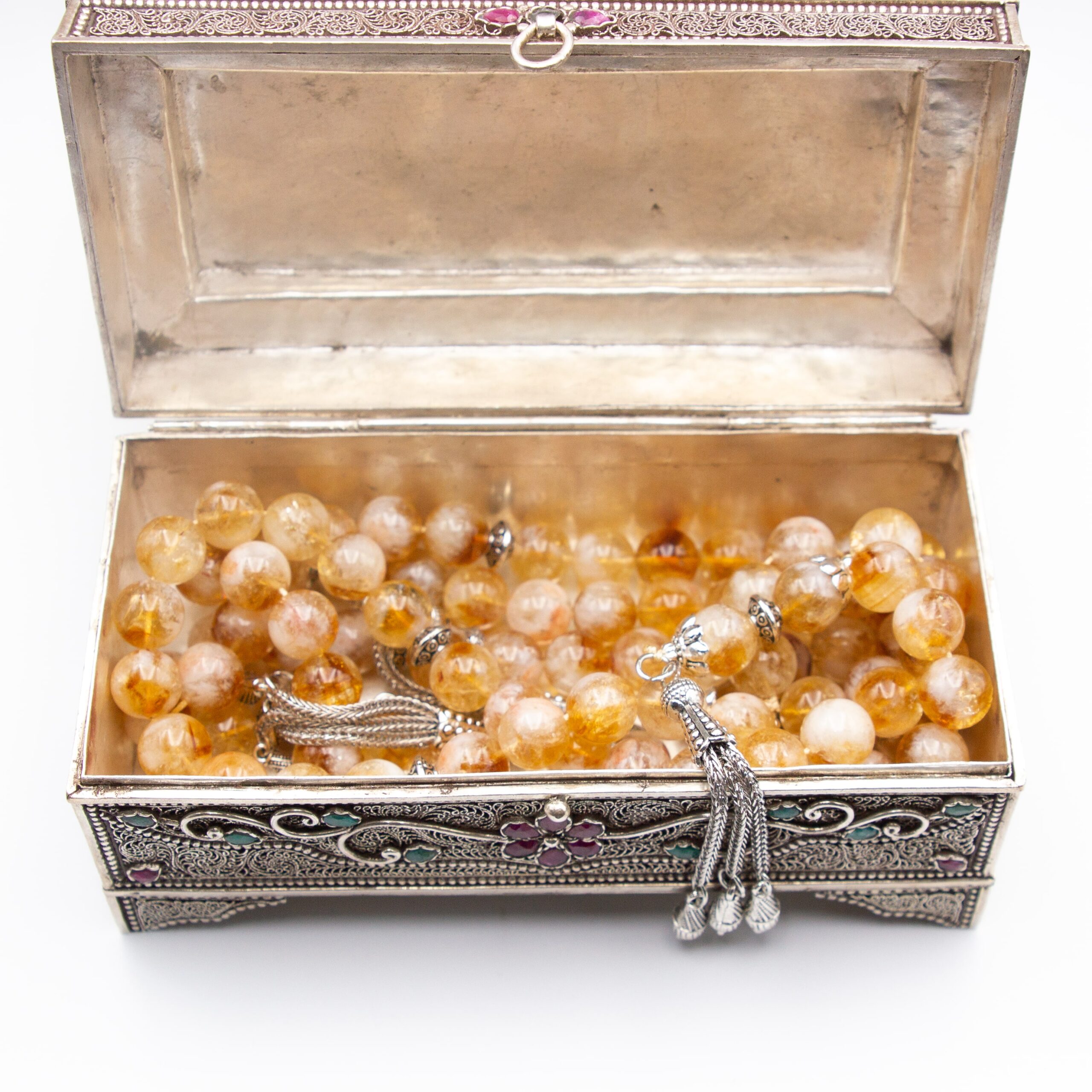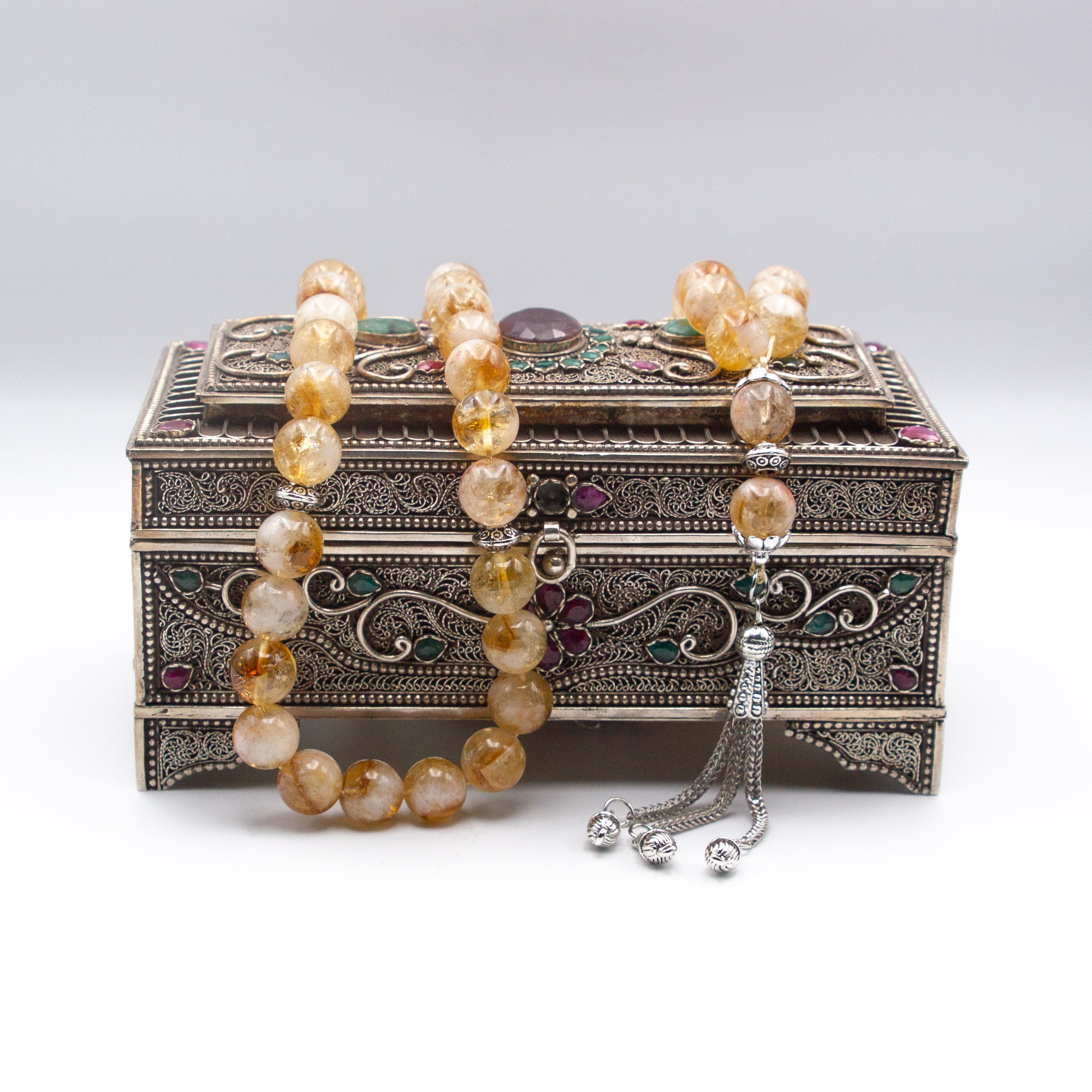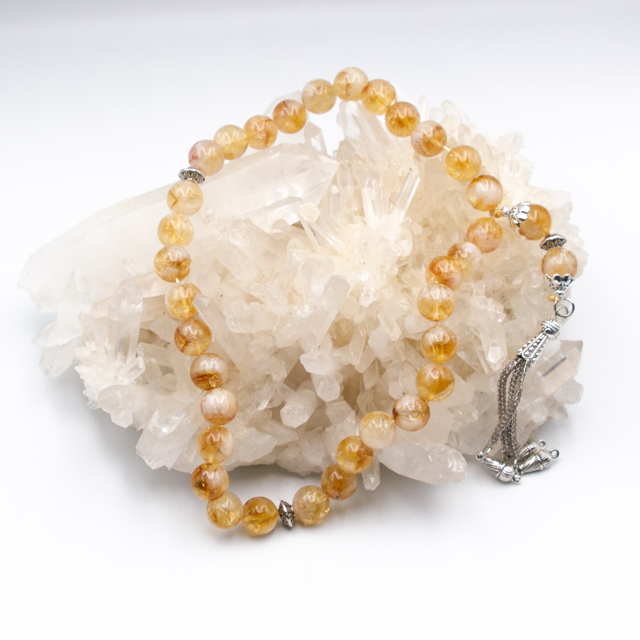 Embrace the serene beauty of these Natural Citrine Crystal Tasbih Prayer Beads. Crafted from authentic citrine crystals, each bead radiates warmth and positivity, making it an ideal companion for your spiritual journey. With a diameter of 10mm and a total of 33 beads, these prayer beads offer a comfortable grip and smooth texture for your prayers and meditation sessions. Let the vibrant energy of citrine crystals uplift your spirit and enhance your focus as you connect with your inner self. Order yours today and elevate your prayer experience with the power of citrine crystals.